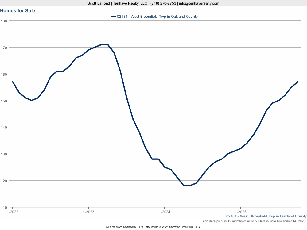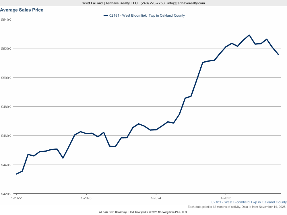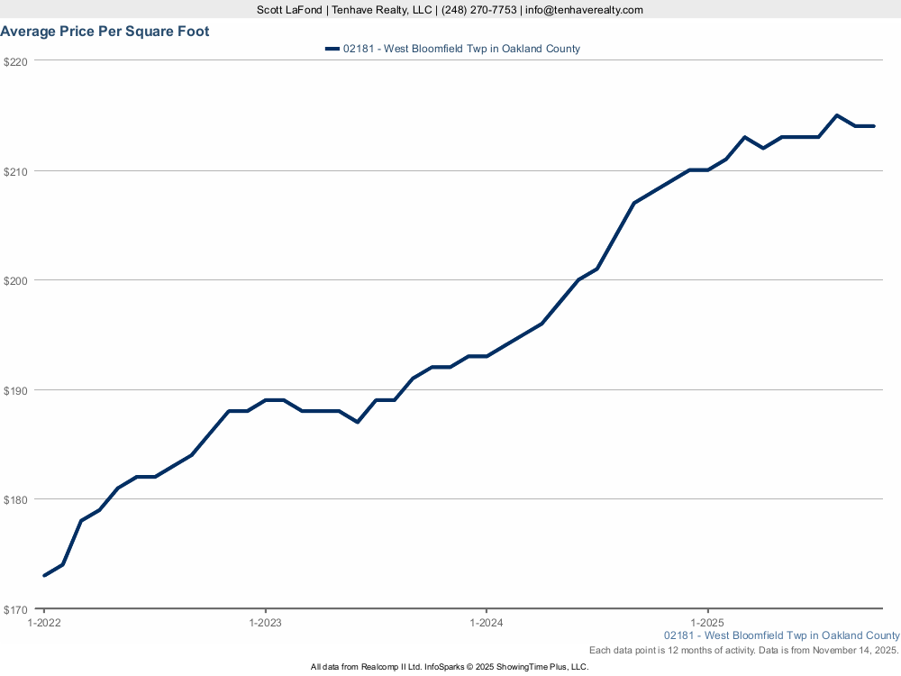 Track the latest West Bloomfield housing market trends with five real-time charts showing pending sales, average sale prices, homes for sale, price per square foot, and average days on market.